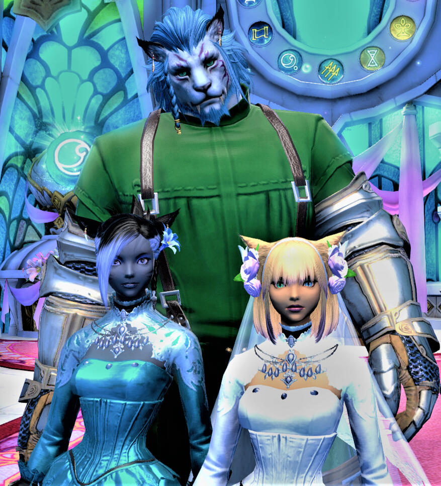 Targur Steelfist, a gentle giant, became a member of the Kyho "household" a short time after meeting C'allie and L'upus. Slowly becoming comfortable with the rambunctious pair, a random visit to L'upus' cabin pushed him into becoming their lover.And some time after that, as comfort grew and the three spent time together and separately, he became a bit more than just that.Present at their wedding, participating in their honeymoon and essentially TOLD he would move with them to Shirogane, Targur found himself with a family he didn't expect. One that became cemented when C'allie and L'upus jointly proposed marriage.A little deception on C'allie's part with Kugane bureaucracy handled what was needed, and now the Hrothgar has two wives to call his own.Wife: C'allie Kyho